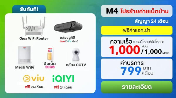 ความเร็ว 1000/1000 mbps +กล่องดูทีวี TrueID TV+Mesh WiFi+กล้องวงจรปิด 1 ตัว ดูพรีเมียร์ลีค ฟรี